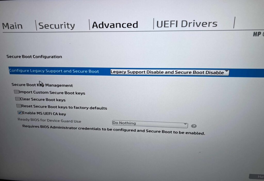 Windows 11を導入したことがあるパソコンであれば必ずSecure Bootいうものがが有効になっております。こちらをEFIの画面で無効にしていきます。EFIの入り方はマザーボードによりそれぞれですが(大体はF2キーや、Delキー)、今回のHP Elite 800 DMに関しては起動時にF8を連打でEFIの画面に入っていきます。Bootっぽい項目で、Secure Bootを無効、EFI Bootを有効、ドライブの起動順をUSB Deviceに変更して、設定を保存します。