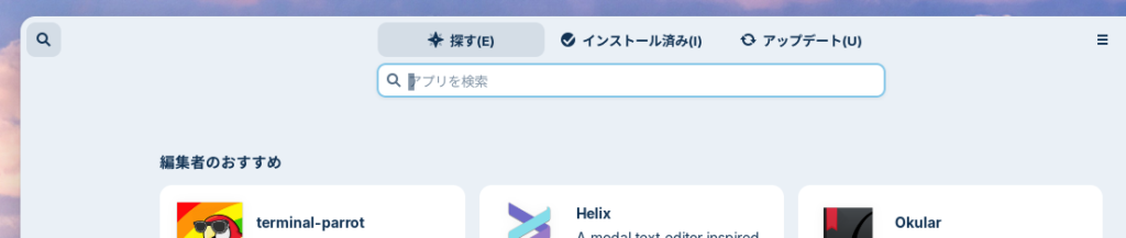 “探す”項目で左上の虫眼鏡のアイコンをクリックするとテキストボックスが出てきますので、キーワードでソフトウェア名を探すことができます。