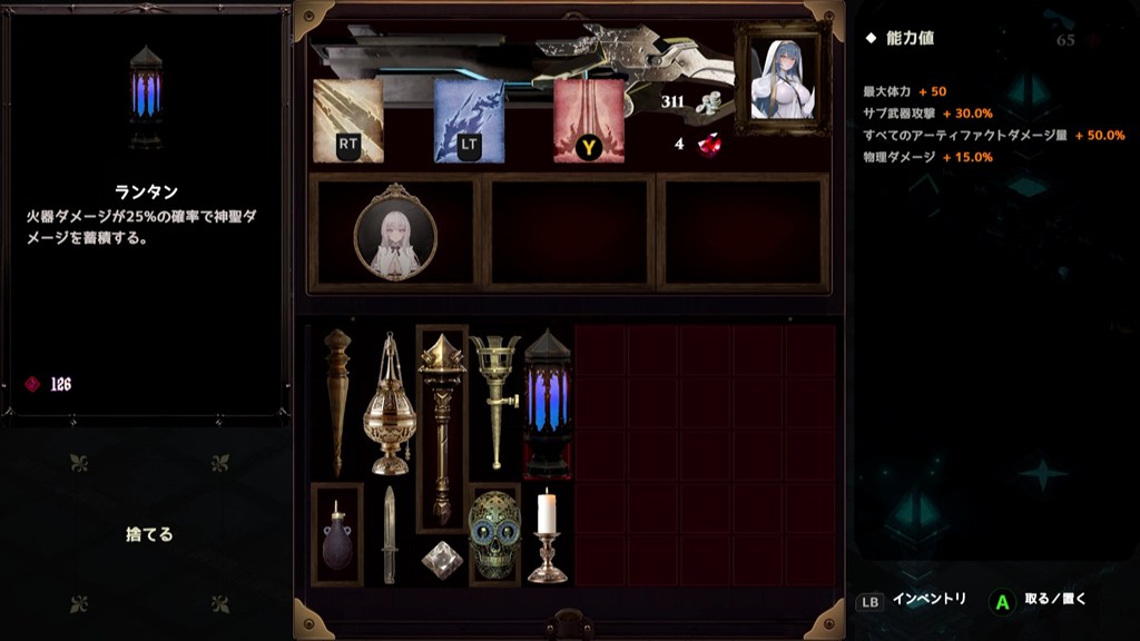 ユニークな点としてテトリス型のインベントリシステムがあり、道中で手に入る「アーティファクト」は、バックパック・バトルのようなグリッド形式のインベントリに配置。